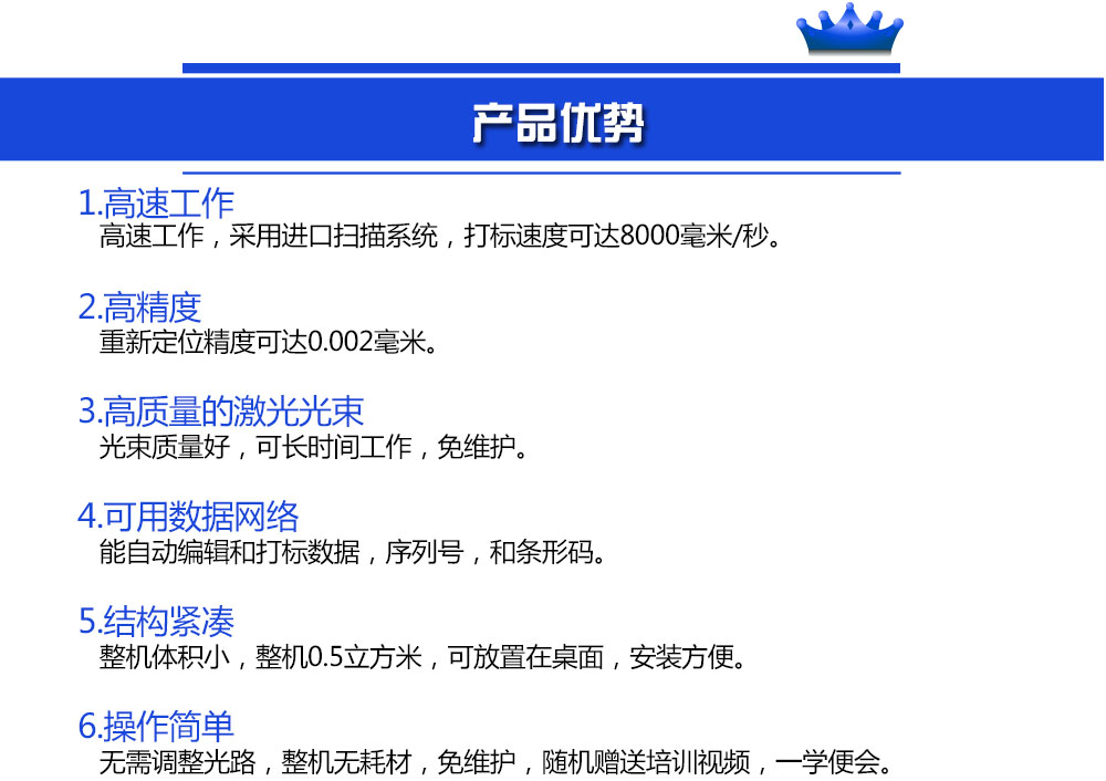 本(běn)公司提供進口激(jī)光(guāng)器的服務,大(dà)大方便了客戶。進口(kǒu)的高速振鏡掃描係統,具有打標精度高,加工速度快等優點,可在(zài)流水線上打印各種文字、符號、圖案及條(tiáo)形碼,特別(bié)適用於硬、脆、軟產品。