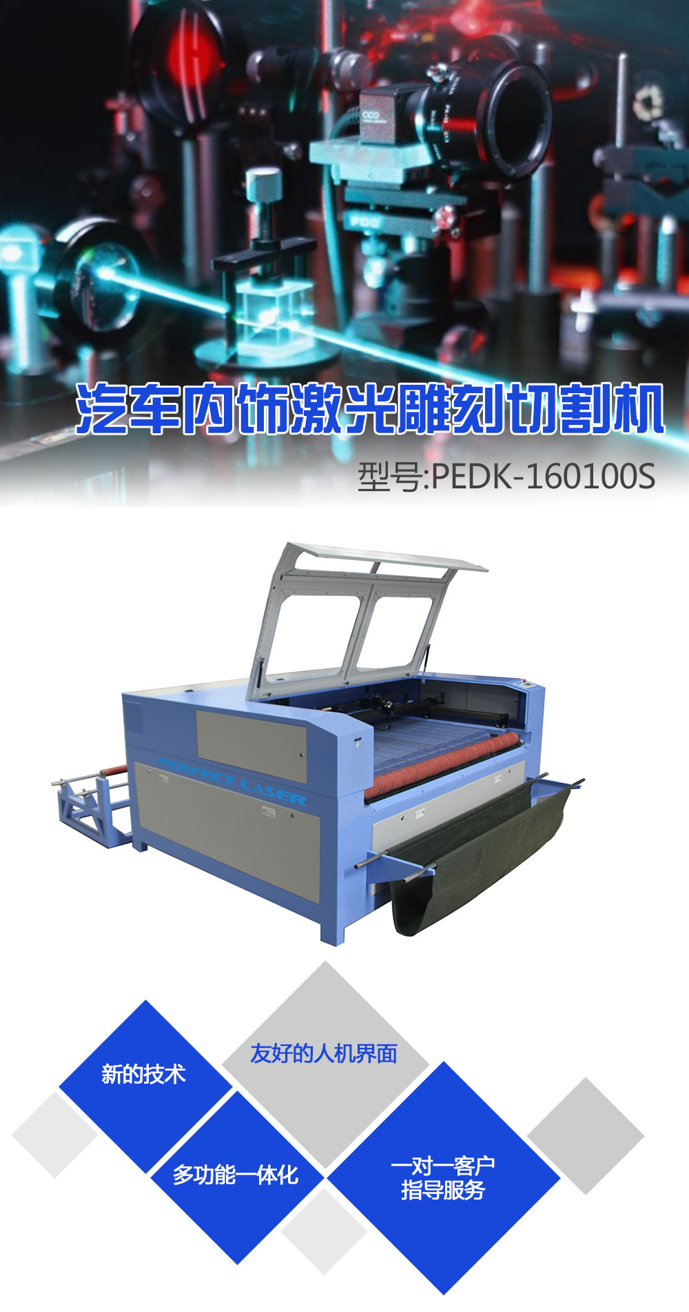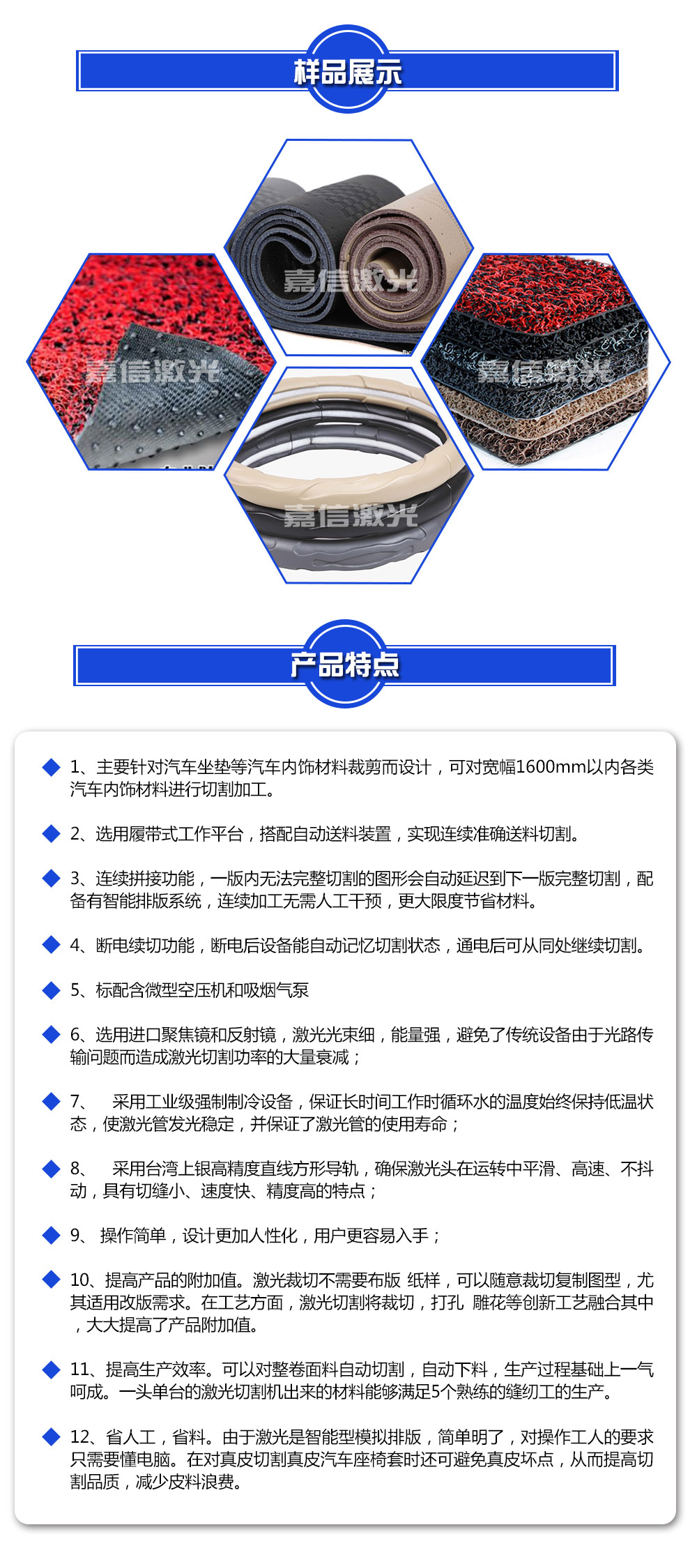 此款汽車坐(zuò)墊激光切割機是主要(yào)針對汽(qì)車座套等汽車內飾材料裁剪而設計,可對寬幅(fú)1600mm以內各類汽車內飾(shì)材料進行切割(gē)加工。搭配自動送料裝(zhuāng)置,實現精準送料,高質量加工。