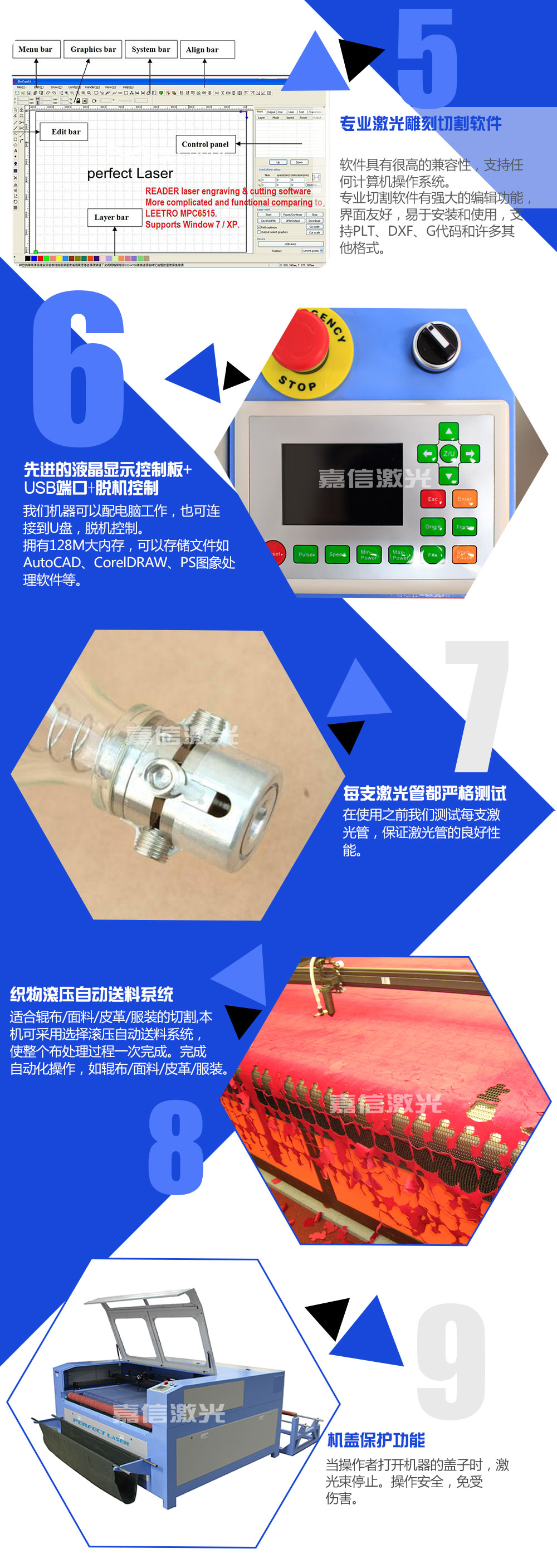 3.汽車坐墊(diàn)激光切(qiē)割機采用工業級強製製冷設備,保證長(zhǎng)時間工(gōng)作時循(xún)環水的溫度始終保持低溫狀態,使激(jī)光管發光(guāng)穩定(dìng),並保證了激光管的使用壽命;