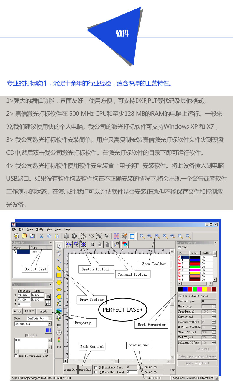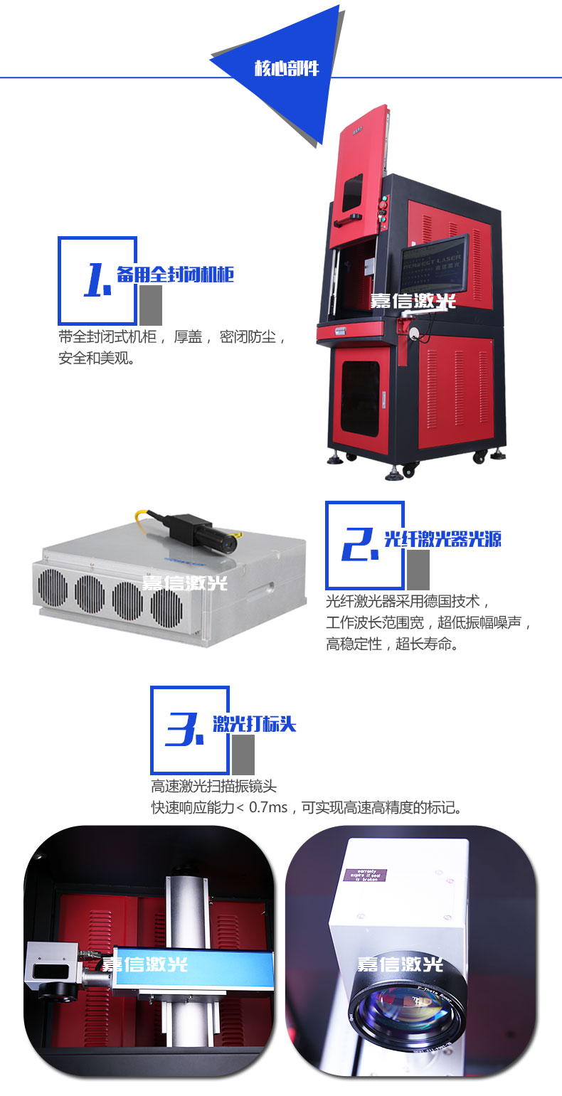 1. 封閉式光纖打標(biāo)機采用進口,高能,穩定的光纖激光一體機,快速精密光學(xué)振鏡(jìng)的軟件係(xì)統;