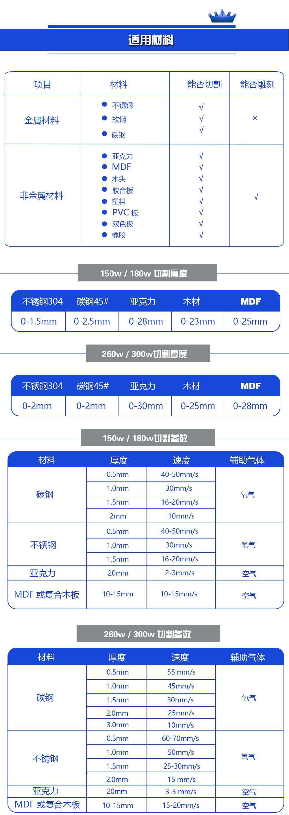 此款金屬非金屬混合切割機可用於1-2mm的不鏽鋼,1-3mm的碳(tàn)鋼,20-30mm亞克力,10-20mm的木材,20-25mm密度板等板材。