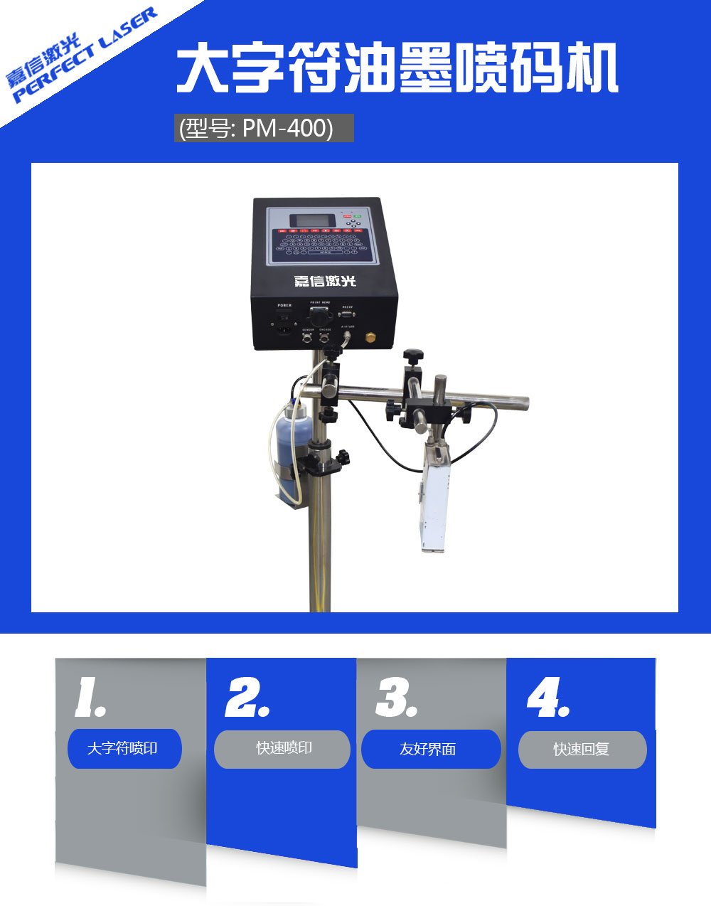 大字符噴碼(mǎ)機,主要用於(yú)產品包裝印刷(shuā)區(qū)號,日期,批號等內容。這種大字(zì)符噴碼機(jī)(也稱為噴墨日期編碼器)被廣泛應用於食品,飲料(liào),醫藥,化工,水泥等(děng)行業。多孔表麵(如普通紙(zhǐ)箱(xiāng),模板(bǎn),紡織品等)和(hé)滲透性表麵(miàn)(如光麵紙(zhǐ)箱,金屬,塑料,陶瓷,和編織(zhī)帶)噴印。