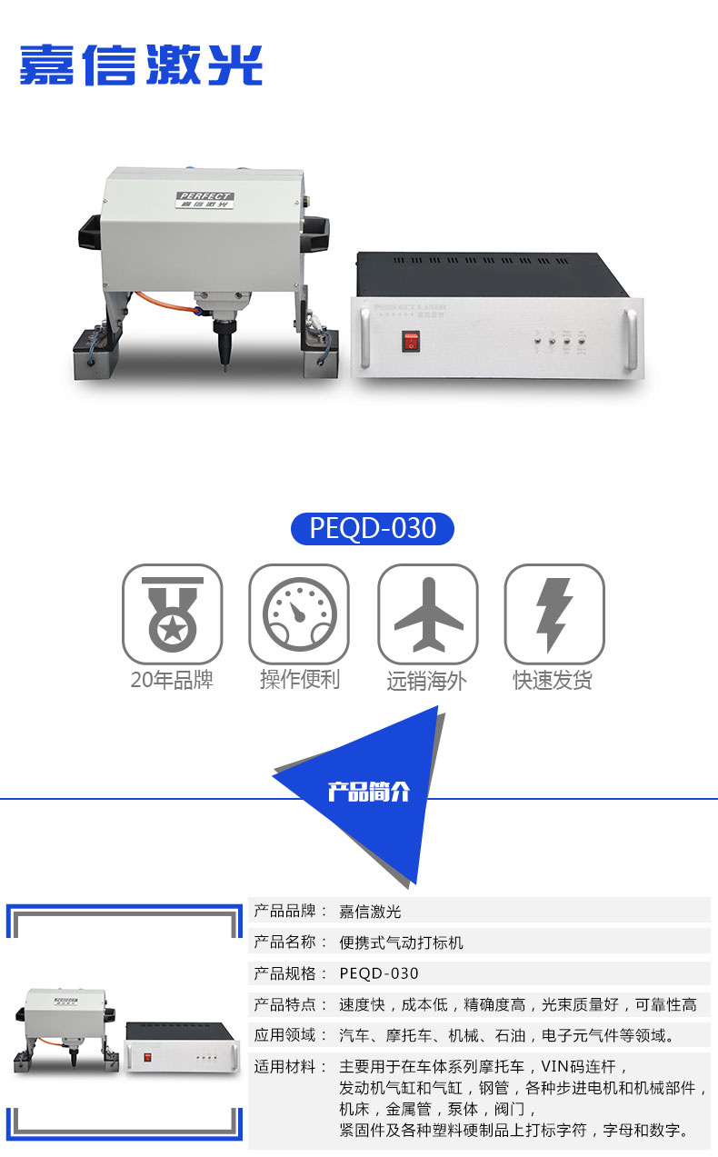 便攜式氣動打標機適合於大型工件或不方便移動工件(jiàn)的打標(如車架(jià)、發動機、油管、大梁等),和配合流水線作業使用,在汽車、摩托車、機械、鋼鐵、石油、航空、電器等多領(lǐng)域皆可應用。