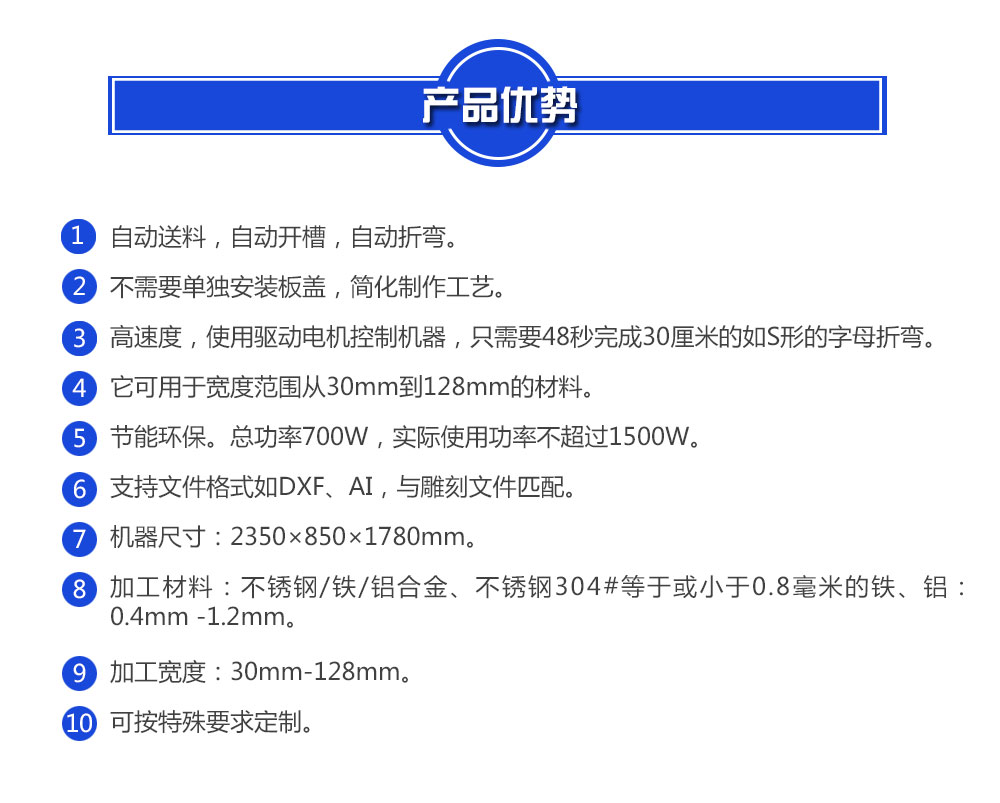 3)操作(zuò)便(biàn)捷(jié):該包邊字折彎機為全自動設備,自動上料,自動開槽,自動折彎;