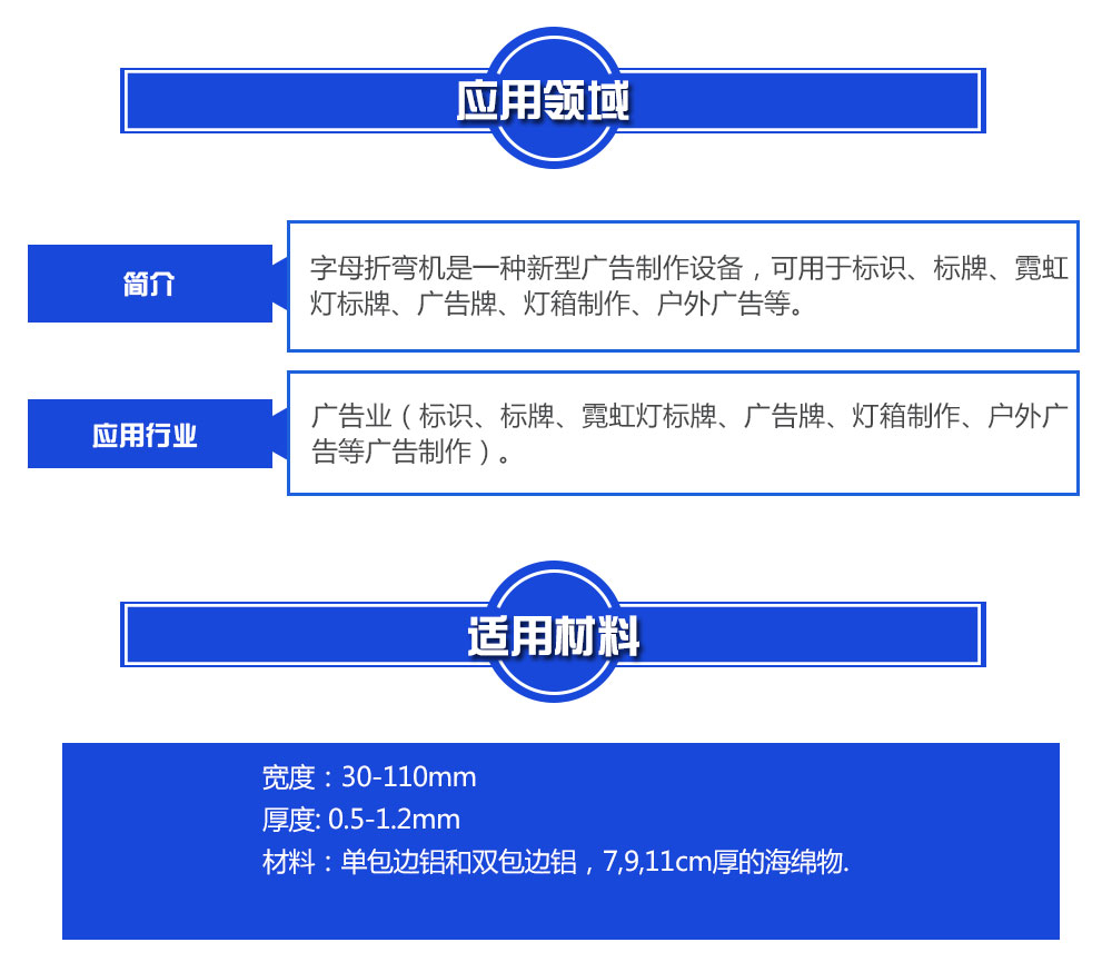 包邊字折彎機適用行業:廣告字行業,如製作外露字,各種(zhǒng)型材圍邊字、無邊字、環氧樹脂字、不(bú)飽和樹脂字、各(gè)類小字等